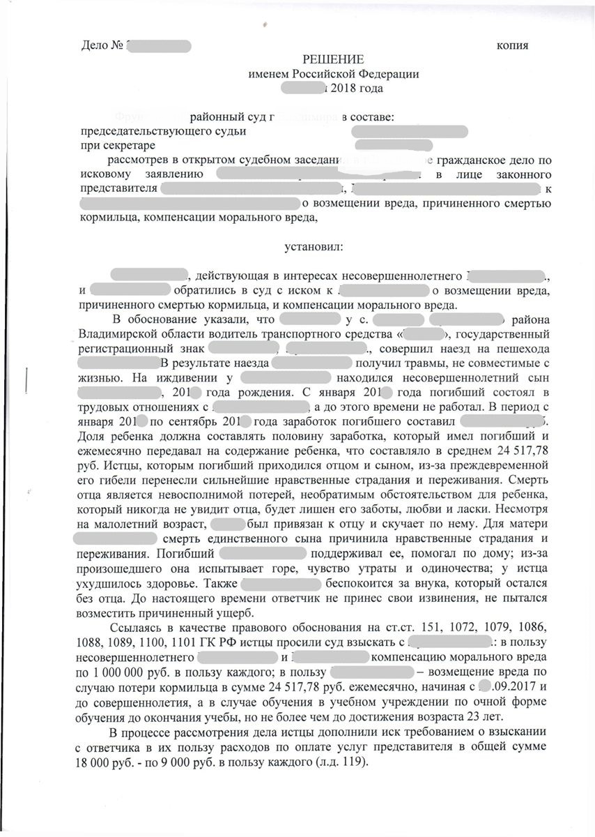 с ответчика составляла 2 000 000 (два  миллиона) рублей, а также ежемесячные денежные платежи в связи с утратой кормильца, были определенны в размере 24517,78 (двадцать четыре тысячи пятьсот семнадцать  рублей, 78 копеек ) до достижения ребенком оставшимся без кормильца возраста 23 лет.